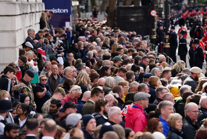 In Hyde Park and along central London streets, the crowd reached up to 30 people deep in areas. Many came prepared with blankets and camping chairs, and some draped themselves in the Union flag. Hyde Park became a focal point, with large numbers watching the service displayed on big screens.